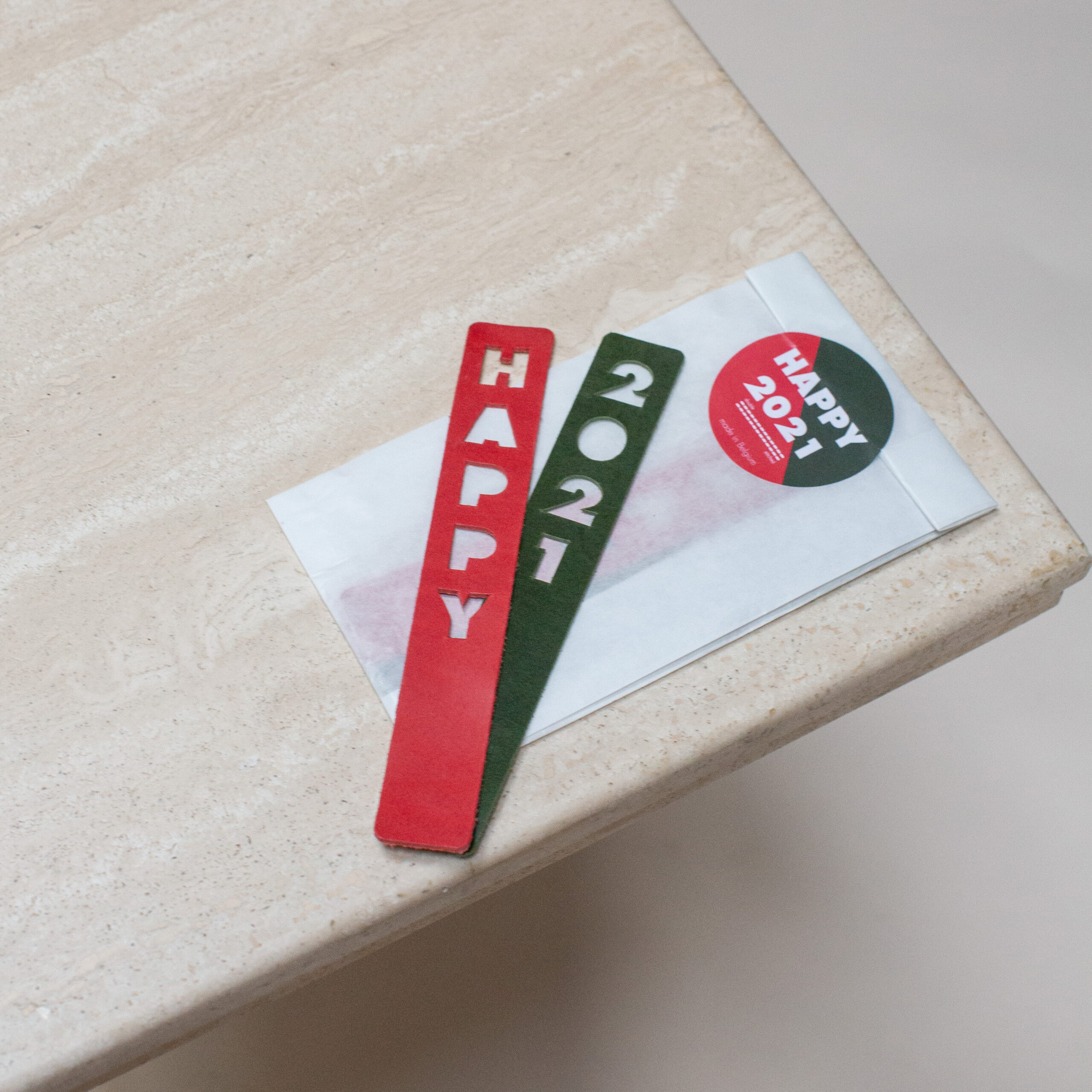 The main purpose of a bookmark is to help readers mark their position in the book, making it easy to continue reading later. To read in style, double stitched designed a series of elegant high-end bookmarks. This limited item is developed in 2021 as the first set of two bookmarks. Happy 2021 features one bookmark with the cut-out word happy in color red and 2021 in green, both made from three millimeter thick leather! The perfect sustainable gift for every book lover!